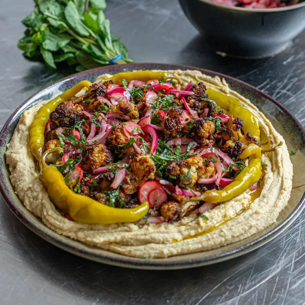 Spicy Roasted Cauliflower with Hummus and Pickles
