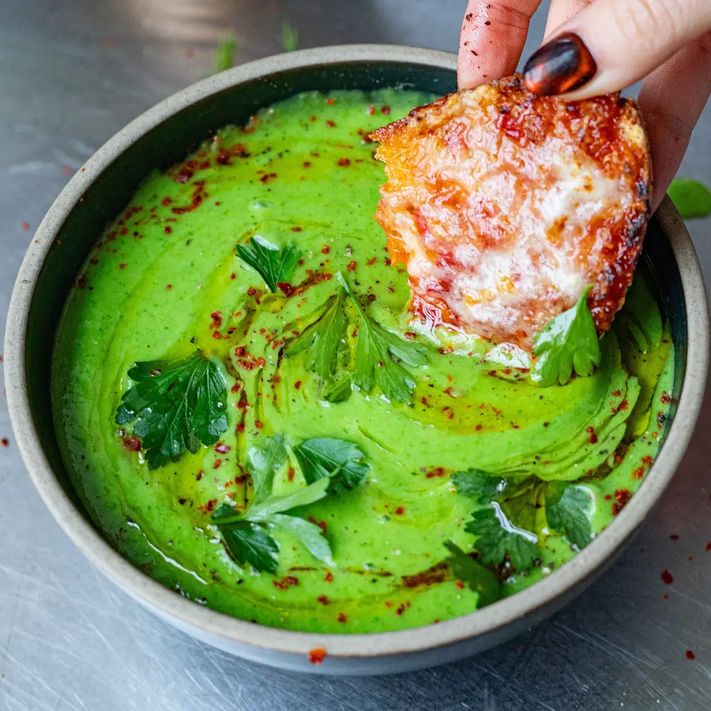 Pea & Leek Soup With Chilli Jam Goat’s Cheese Toasts