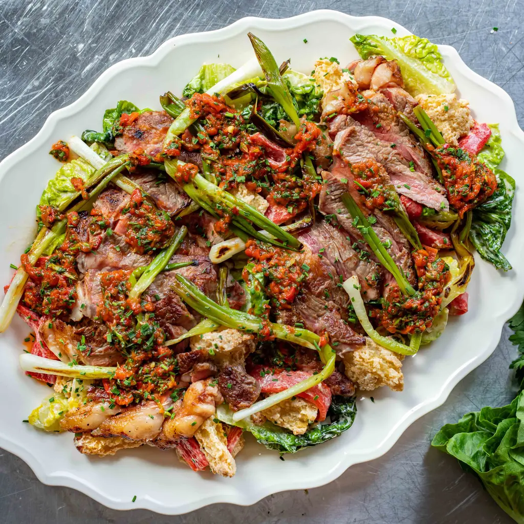 Steak Salad with Roasted Pepper Chimichurri and Garlic Croutons
