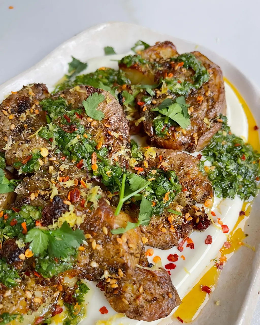 Za’atar Smashed Potatoes, Yoghurt & Zhoug