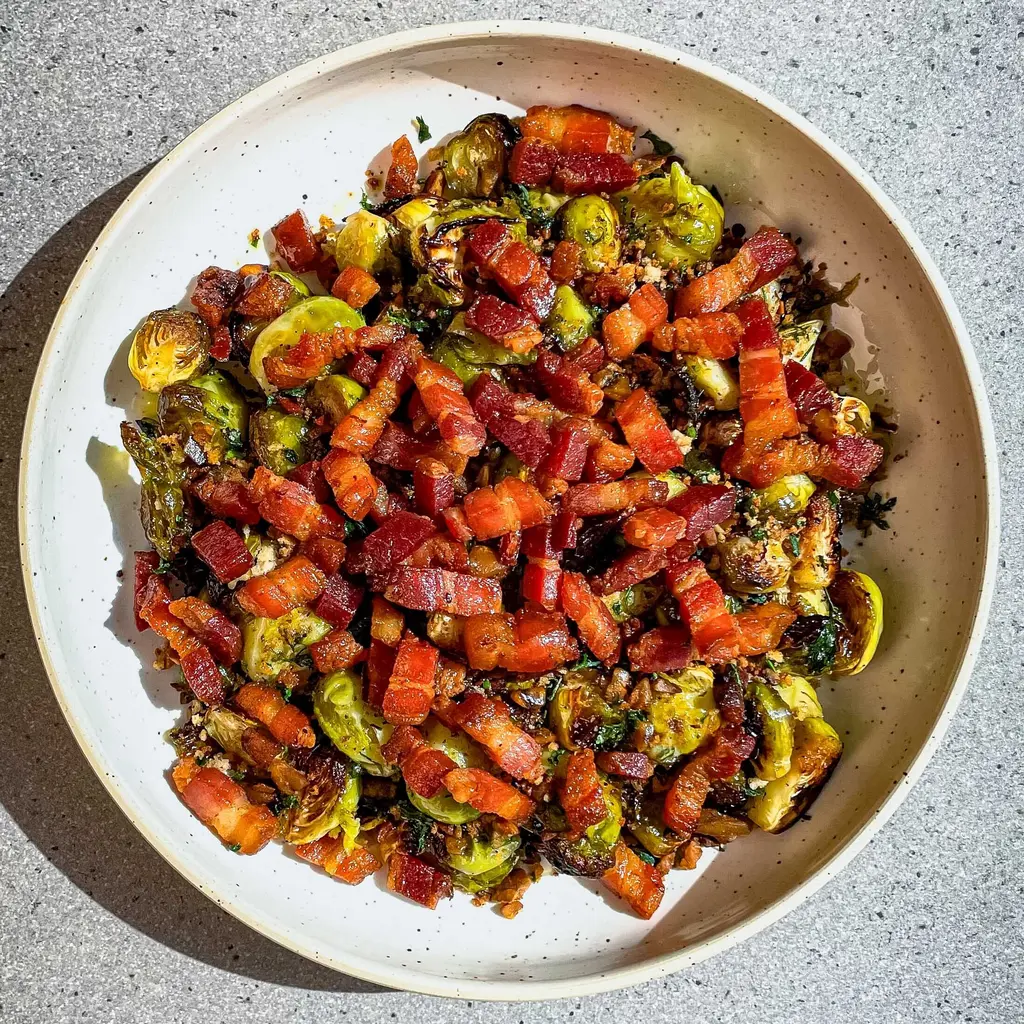 Roasted Brussels Sprouts with Chestnut Crumble & Smoked Bacon