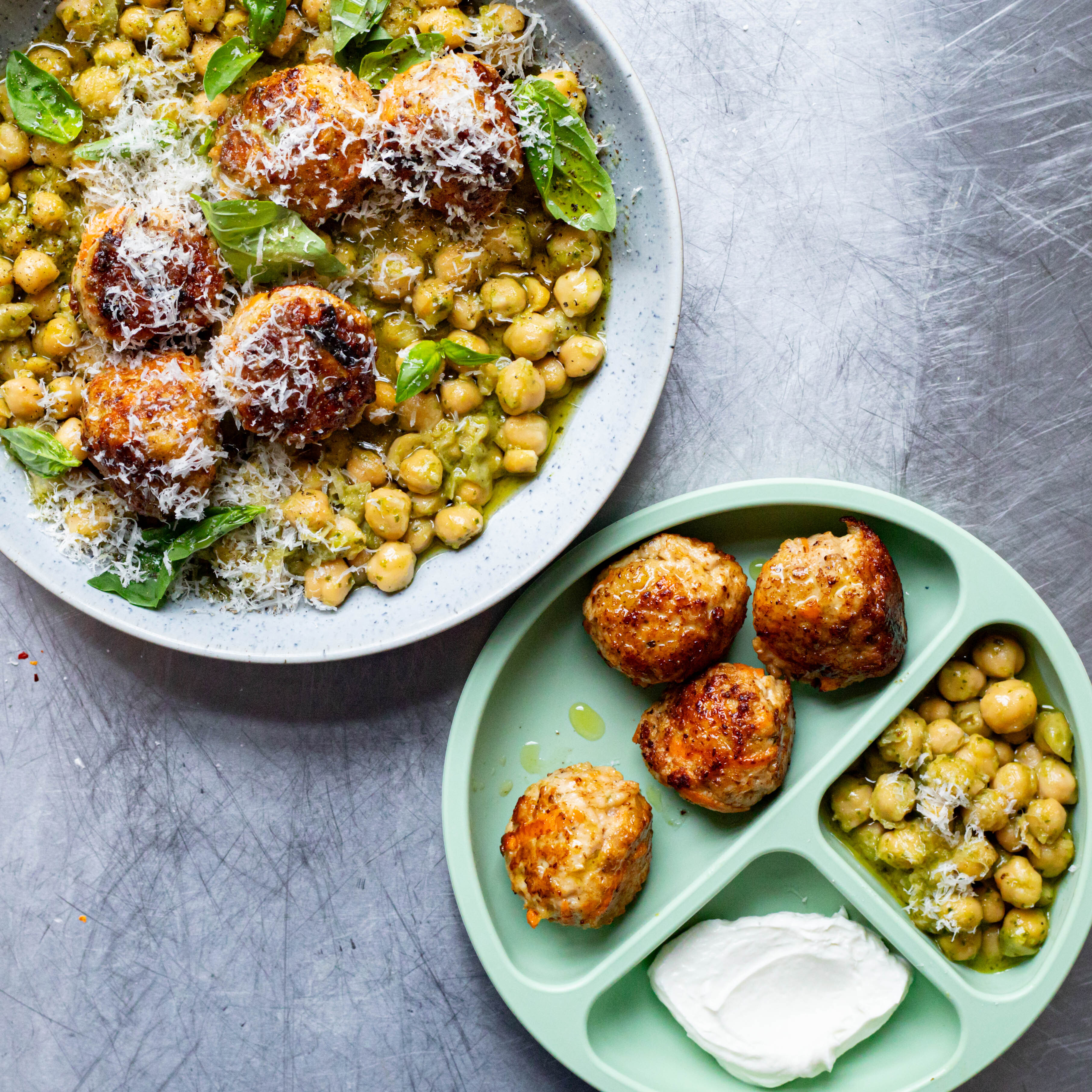 Crispy Chicken Meatballs & Pesto Chickpeas