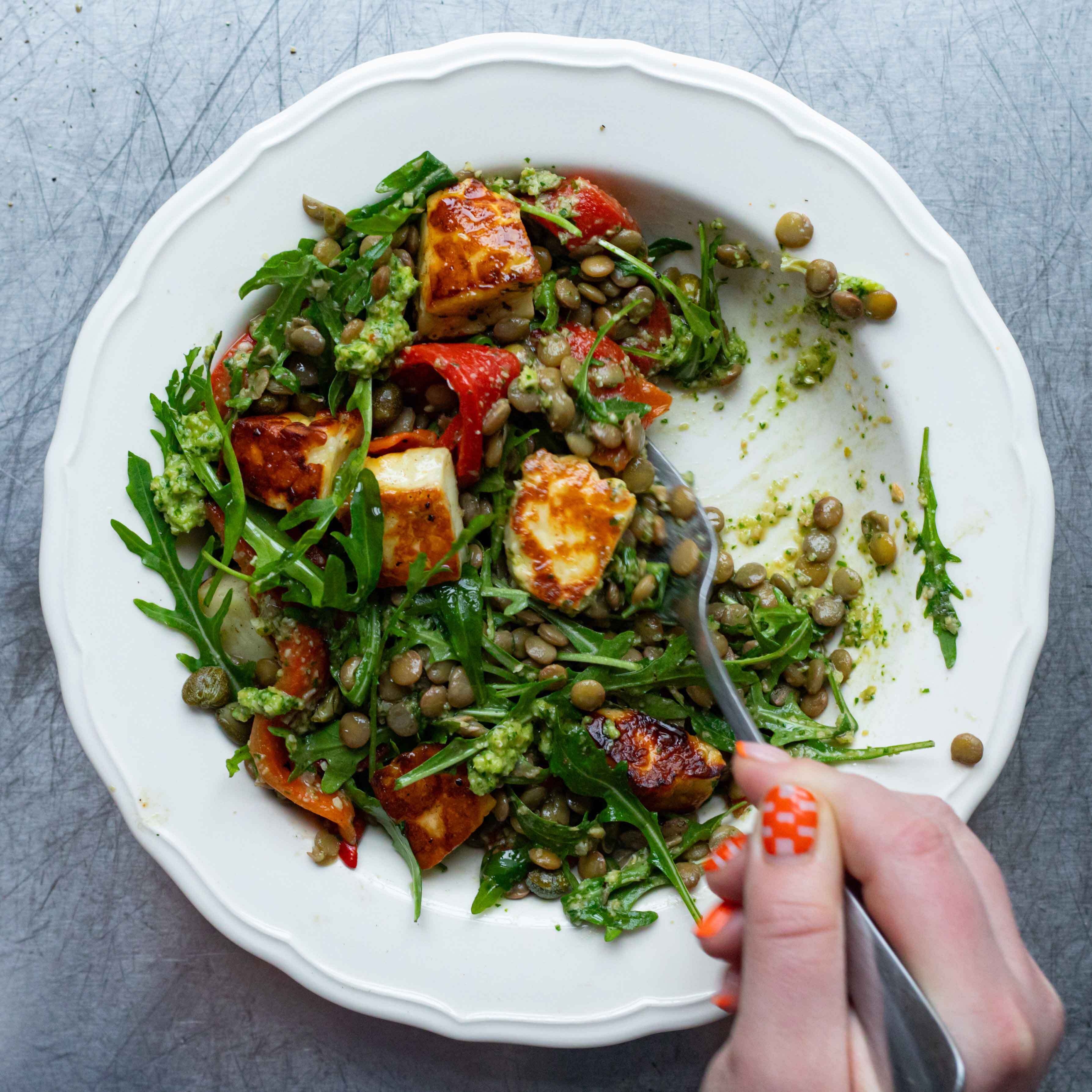 Olive & Almond Pesto Lentils With Halloumi