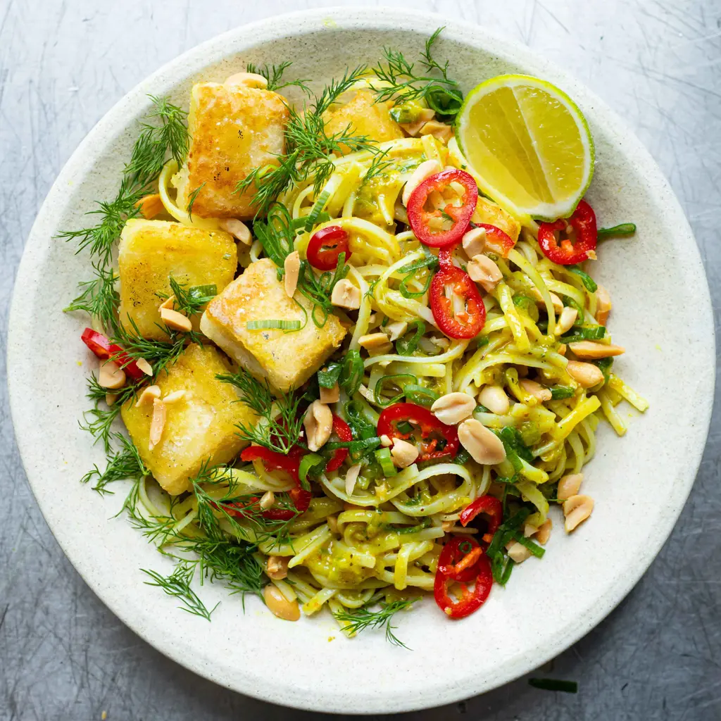 Crispy Tofu Noodles with Vibrant Turmeric Dressing