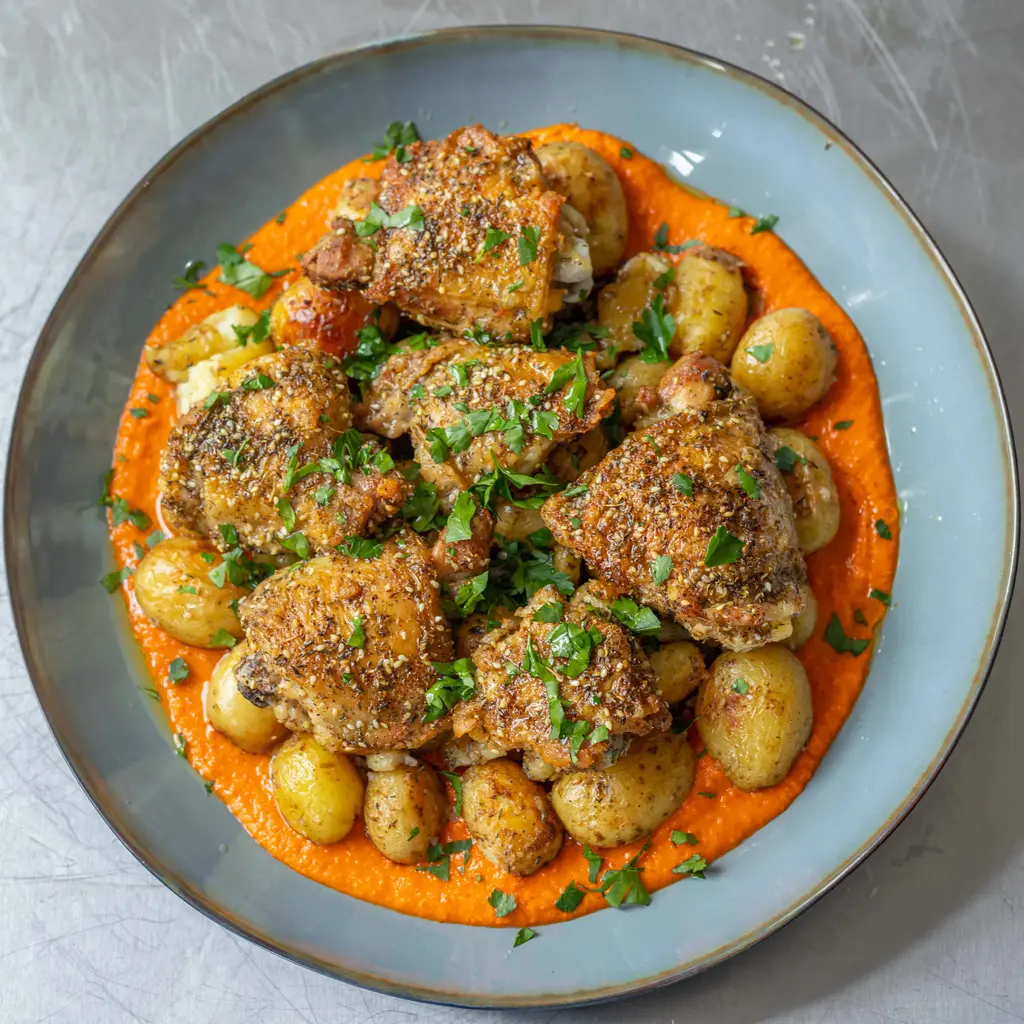 Crispy Za'atar Chicken Thighs with Roast Potatoes and Romesco Sauce