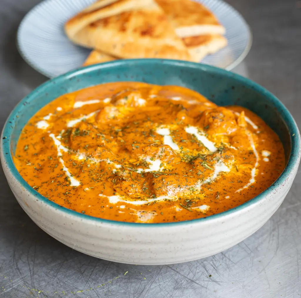 Serve with rice or naan bread and garnish with another drizzle of cream and a pinch of methi.