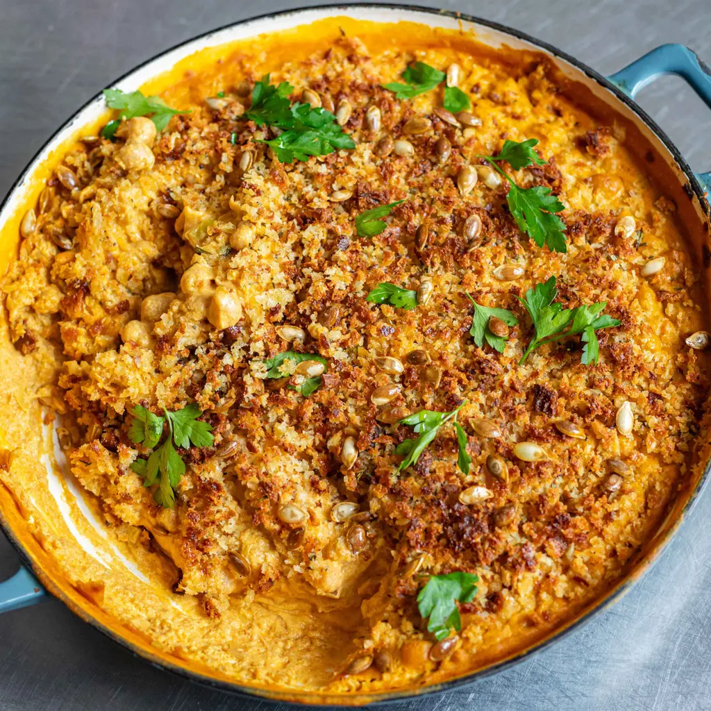 Pour the cheesy sauce over the chickpea mix. Mix in well and leave on a low heat whilst you whizz-up the bread in a clean, dry bullet cup or blender. Add the crumbs to a large bowl, along with 1½ tbsp olive oil, the garlic powder, ½ tsp salt and the rosemary. Toss well to combine and layer over the chickpeas in a thin crust. Roast in the oven or under the grill until golden and bubbly.